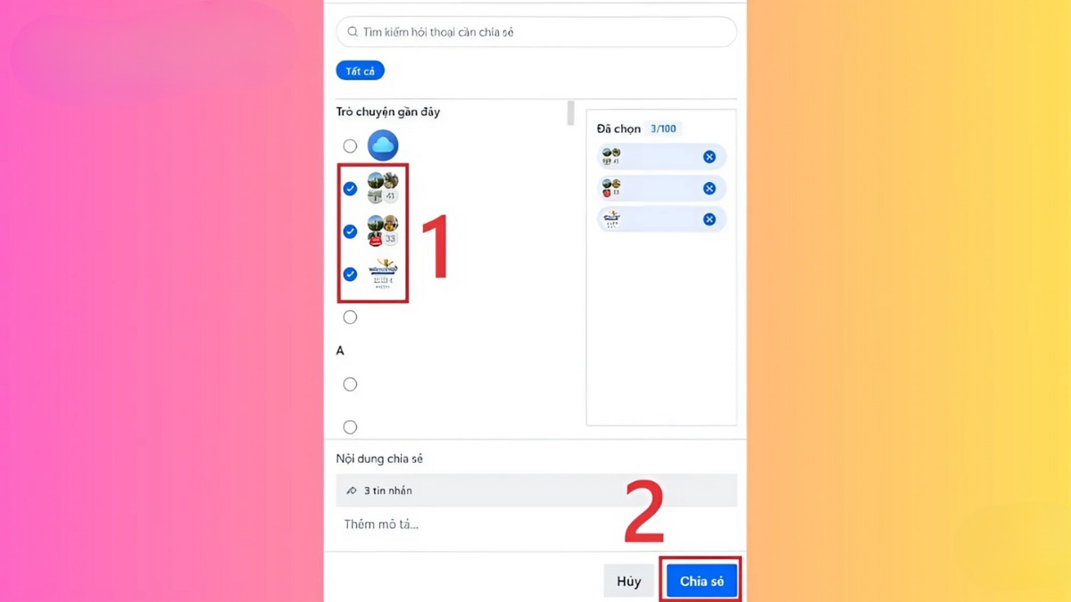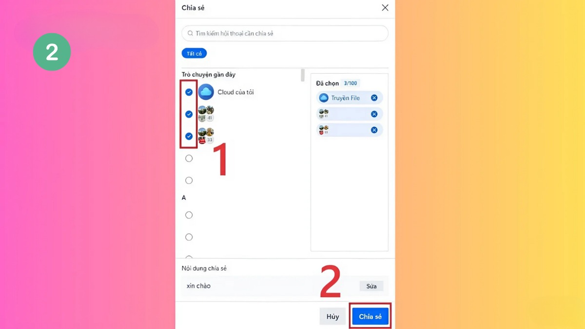 Bước 3: Chọn danh sách người nhận phù hợp và nhấn “Chia sẻ” để hoàn tất việc gửi tin nhắn hàng loạt.