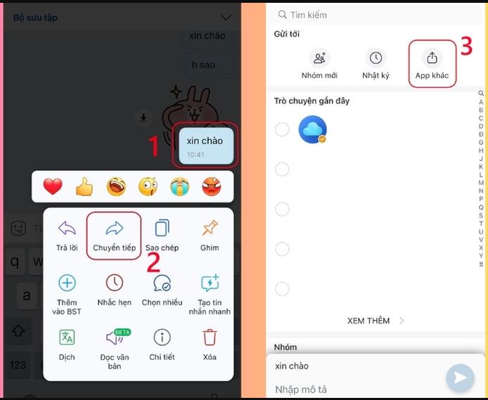 Bước 2: Nhấn giữ tin nhắn cho đến khi xuất hiện các tùy chọn > chọn mục “Chuyển tiếp” > đánh dấu những người hoặc nhóm cần gửi tới > nhấn gửi để hoàn thành.