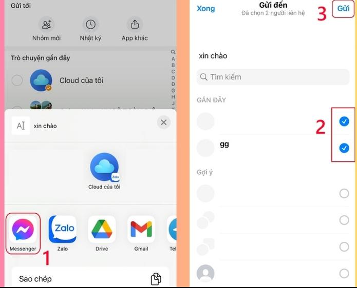 Bước 3: Chọn loại ứng dụng muốn chia sẻ như Messenger, Gmail, hoặc bất kỳ nền tảng nào được hỗ trợ. Sau đó, chọn người nhận phù hợp và nhấn “Gửi” để hoàn tất quá trình chia sẻ.